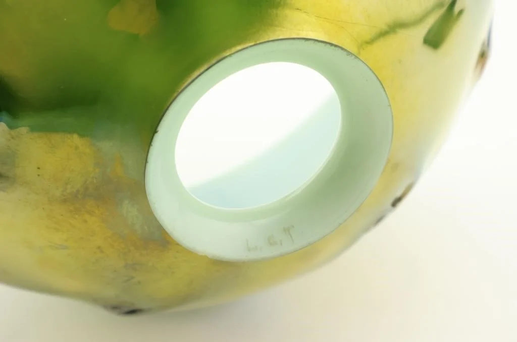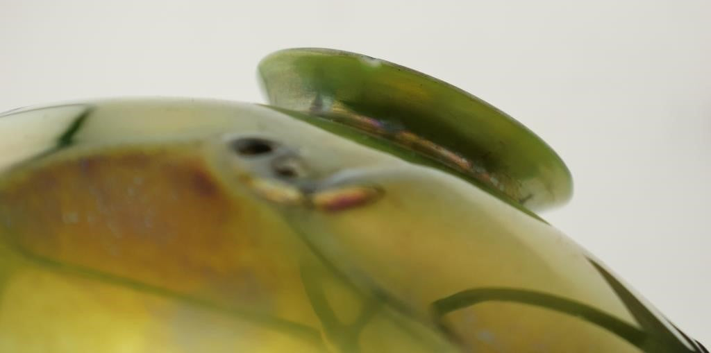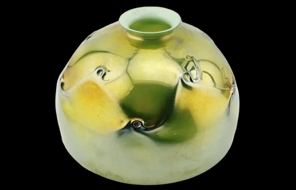 The dome-form shade is executed in lustrous Favrile glass in rich chartreuse and yellow-green tones, adorned with applied dark green trailed and coiled glass decoration — a classic organic motif characteristic of Tiffany Studios' blown glass production. The shade exhibits the hallmark iridescence and depth of color achieved through Tiffany's proprietary glassmaking techniques.