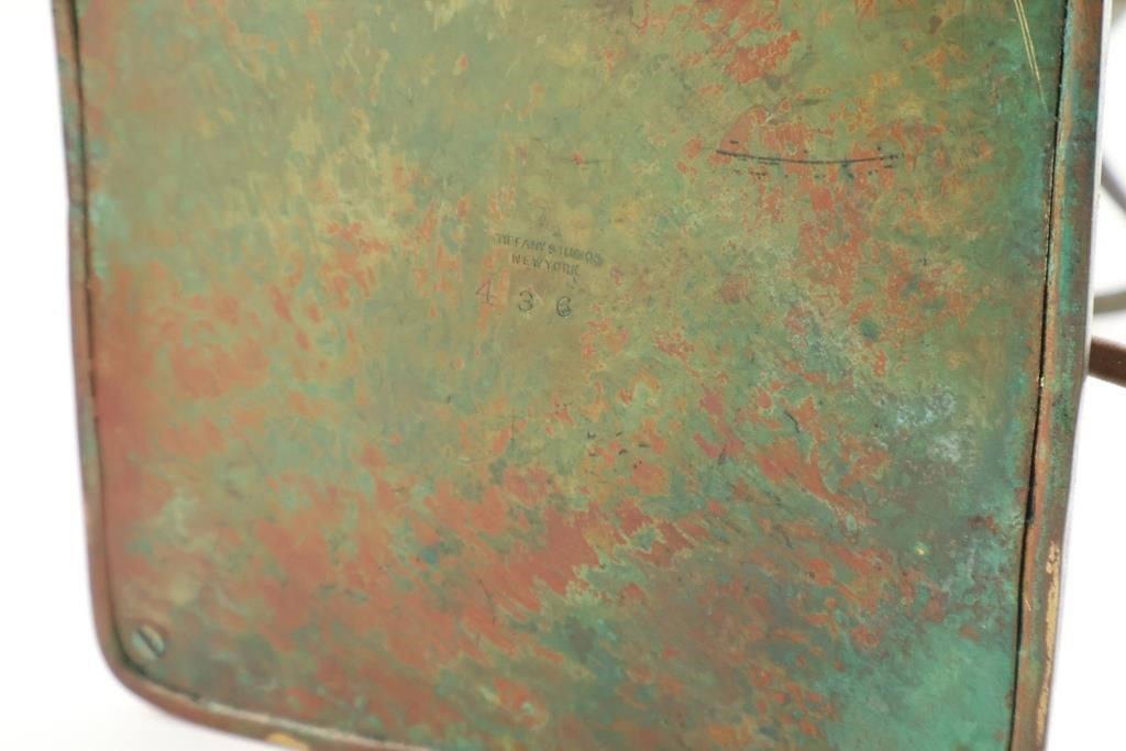 The slender patinated bronze base features a gracefully tapering columnar stem with Art Nouveau-style curved arm supports and a molded square foot with fan-leaf decoration at the base — design elements consistent with the studio's boudoir lamp production of the period.